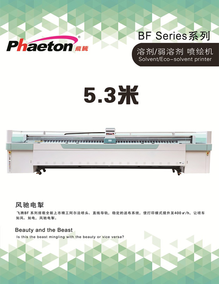 飛騰BF系列搭載全新上市精工阿爾法噴頭、直線(xiàn)導(dǎo)軌,穩(wěn)定的送布系統(tǒng),使打印模式提升至400㎡/h,讓噴車(chē)如風(fēng)、如電,風(fēng)馳電掣。