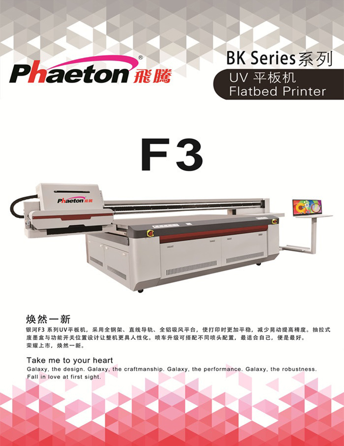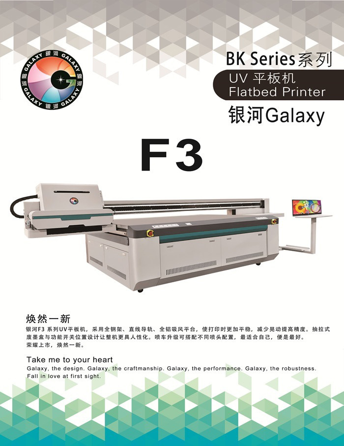 銀河F3系列UV平板機(jī),采用全鋼架、直線(xiàn)導(dǎo)軌、全鋁吸風(fēng)平臺(tái),使打印時(shí)更加平穩(wěn),減少晃動(dòng)提高精度。抽拉式廢墨盒與功能開(kāi)關(guān)位置設(shè)計(jì)讓整機(jī)更具人性化。噴車(chē)升級(jí)可搭配不同噴頭配置,最適合自己,便是最好。 榮耀上市,煥然一新。