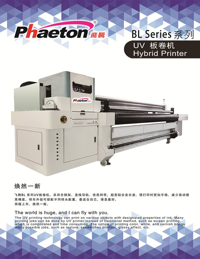 飛騰BL系列UV板卷機(jī),采用全鋼架、直線(xiàn)導(dǎo)軌、優(yōu)質(zhì)網(wǎng)帶,超寬鋁合金臺(tái)面,使打印時(shí)更加平穩(wěn),減少晃動(dòng)提 高精度。噴車(chē)升級(jí)可搭配不同噴頭配置,最適合自己,便是最好。 榮耀上市,煥然一新。